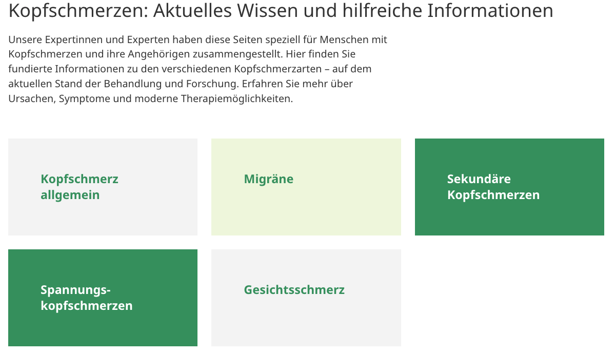 Neu ergänzt wurden unter anderem die Seiten Gesichtsschmerzen sowie Spannungskopfschmerzen in der Rubrik Wissen für Patientinnen und Patienten.